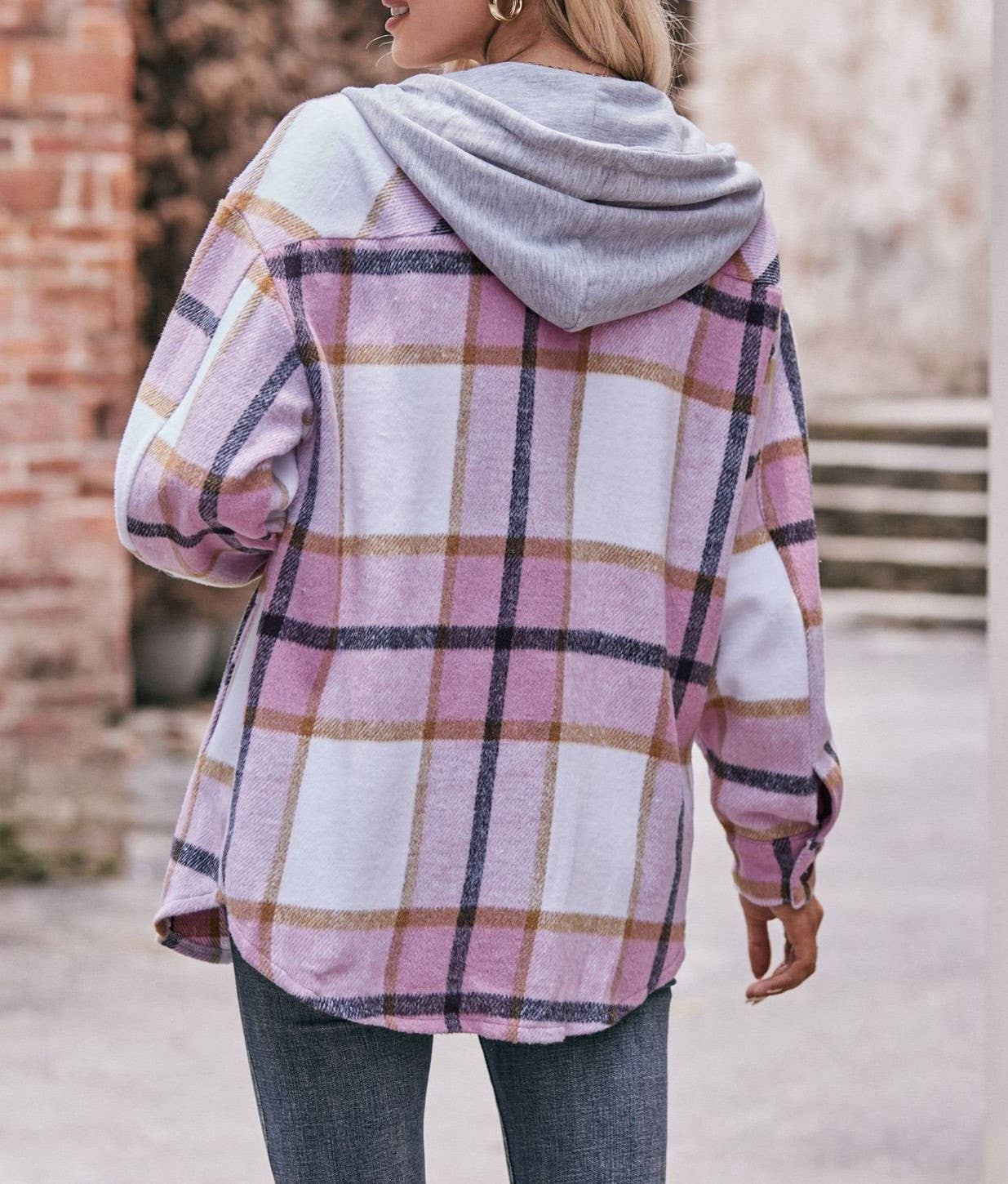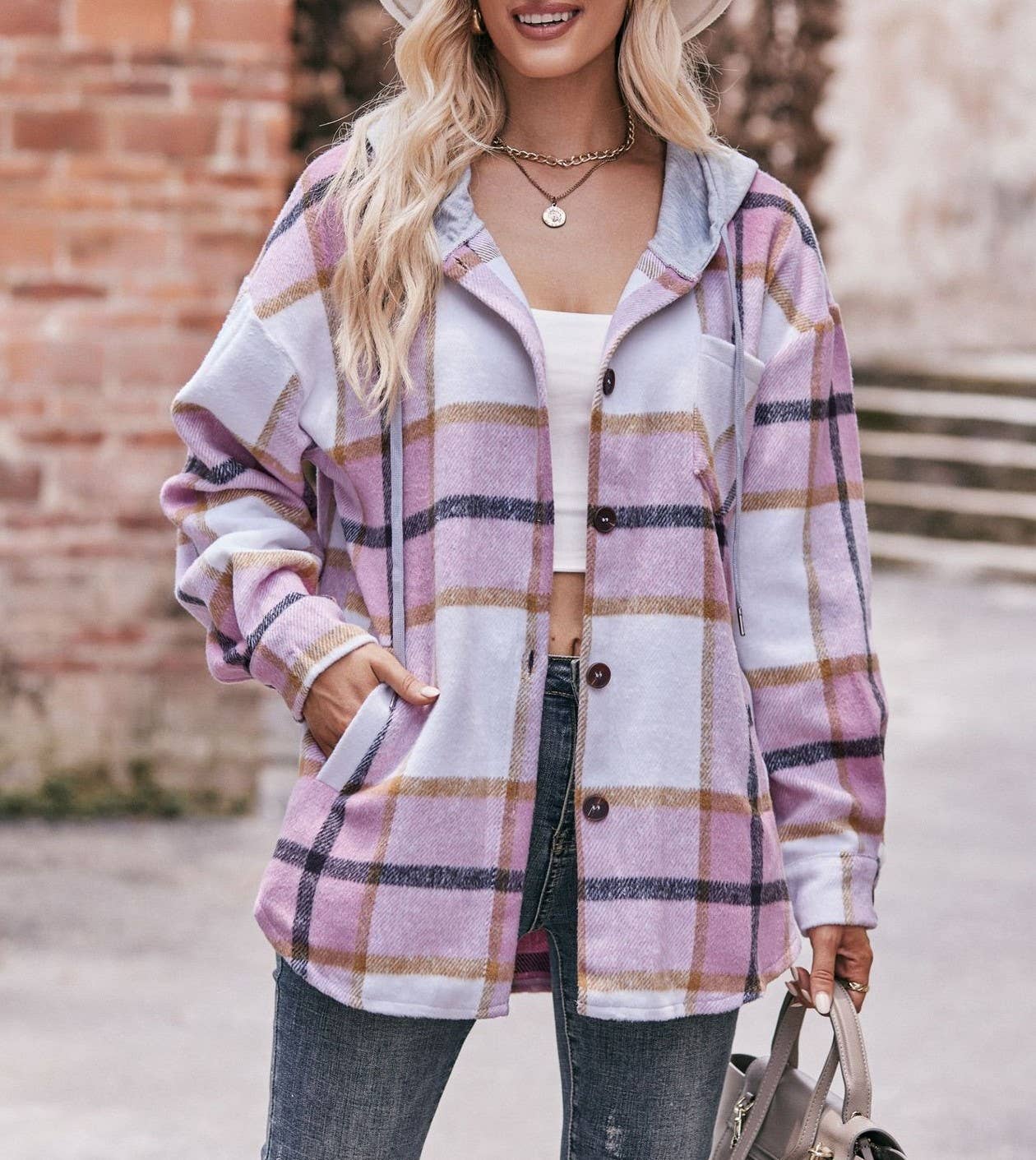 Kristy Plaid Hooded Shacket – Lavender & Blush Midi Shirt Jacket